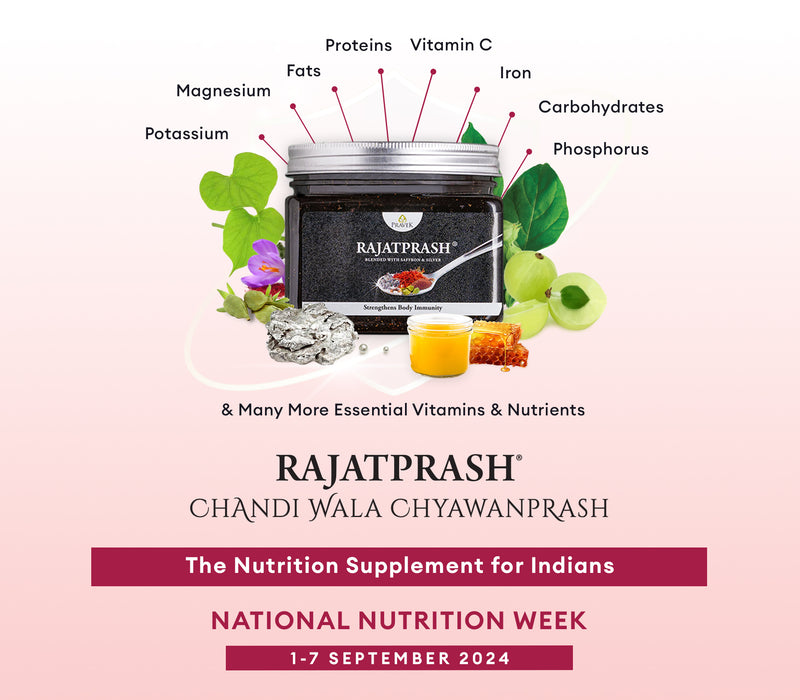 As we focus on nutrition during this week, it's the perfect time to introduce Rajatprash into your daily routine. Rajatprash, Chandi Wala Chyawanprash, is not just any Chyawanprash—it's a powerhouse of essential nutrients that support overall health. This Ayurvedic formulation is fortified with Pure Saffron, Vegetarian Silver Waraq, Mukta Panchamrit, and Unadulterated Honey, making it an exceptional product for those looking to lead a healthy and disease-free life. Rajatprash is a complete nutrition supplement for Indians, as it has many essential vitamins and nutrients like – Potassium, Magnesium, Healthy Fats, Proteins, Vitamin C, Iron, Carbohydrates, Phosphorus and others.