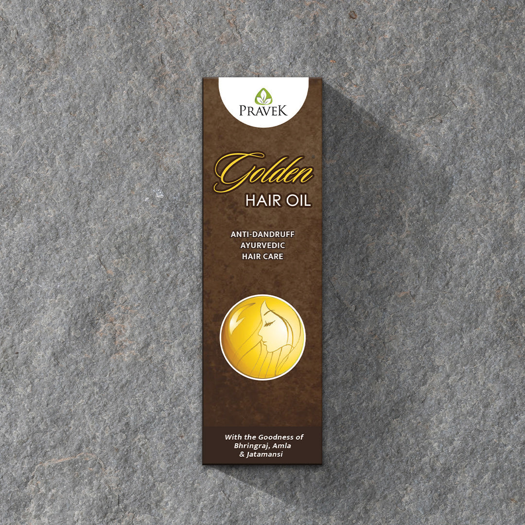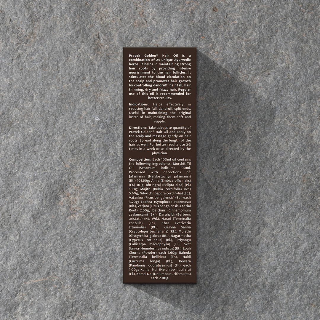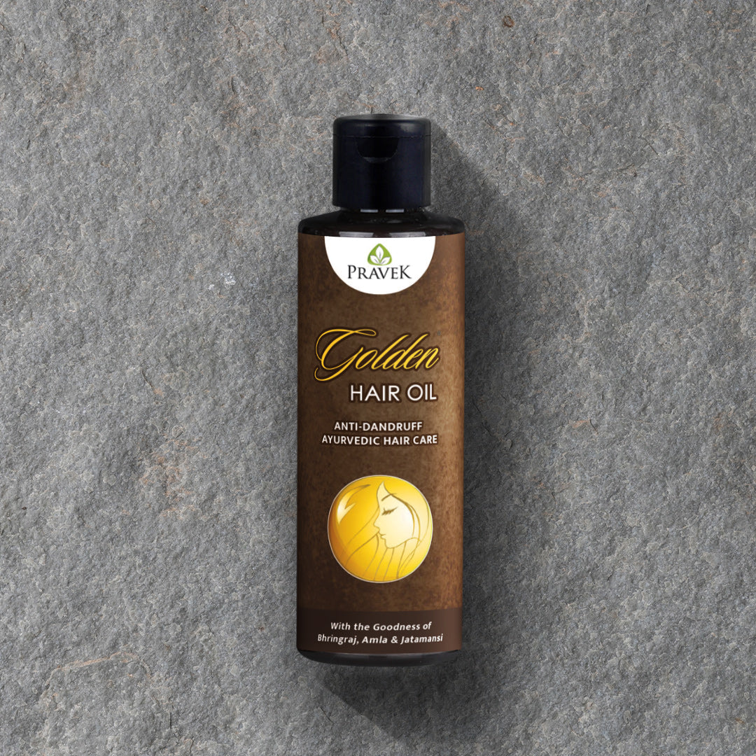 Pravek Golden Hair Oil is a Ayurvedic hair oil made of purified sesame oil with 24 natural herbal ingredients like Bhringraj, Amla, Jatamansi and Manjishtha. It is an effective anti-dandruff hair oil that also helps reduce hair fall, thinning of the hair and split ends while deeply nourishing the scalp and promoting healthy, strong hair growth.