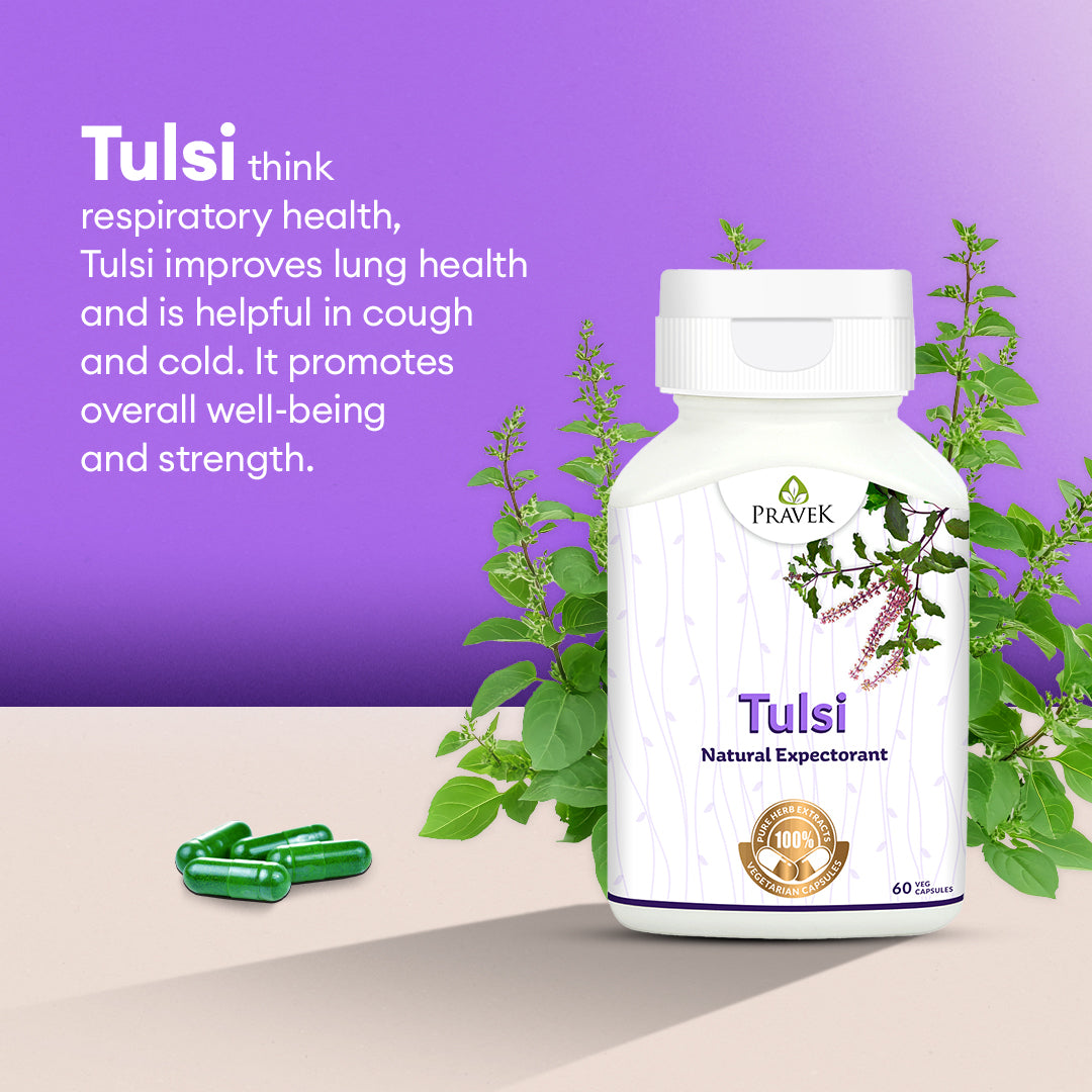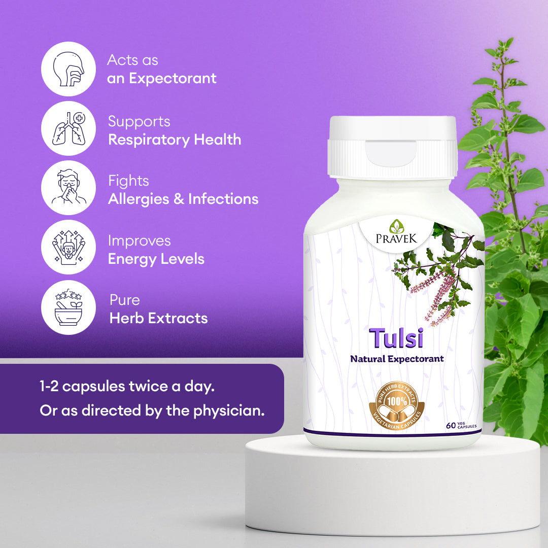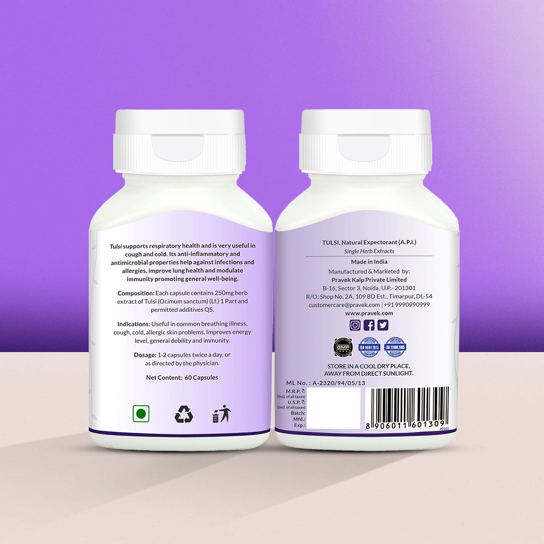 Tulsi or Holy Basil is known as the ‘Queen of Herbs’ in Ayurveda as it has multiple health benefits. Tulsi Capsules by Pravek are made from pure extracts of high quality Tulsi leaves. They support your lung health, strengthen your immune system, help fight infections and allergies, common cough and cold, and much more!